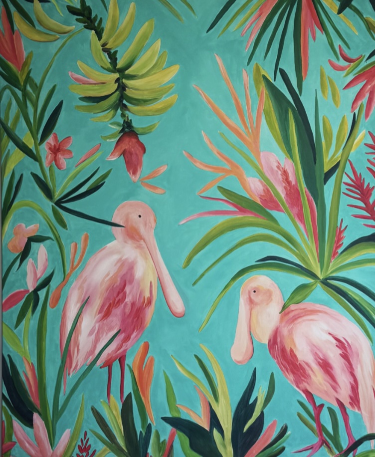 Two roseate spoonbills nestle among a lush explosion of tropical foliage -- swaying palms, birds of paradise, and hanging banana blossoms -- all set against a signature teal Caribbean sky. The bold, graphic composition and joyful palette of pinks, greens, and corals make this a statement piece designed to brighten any space.